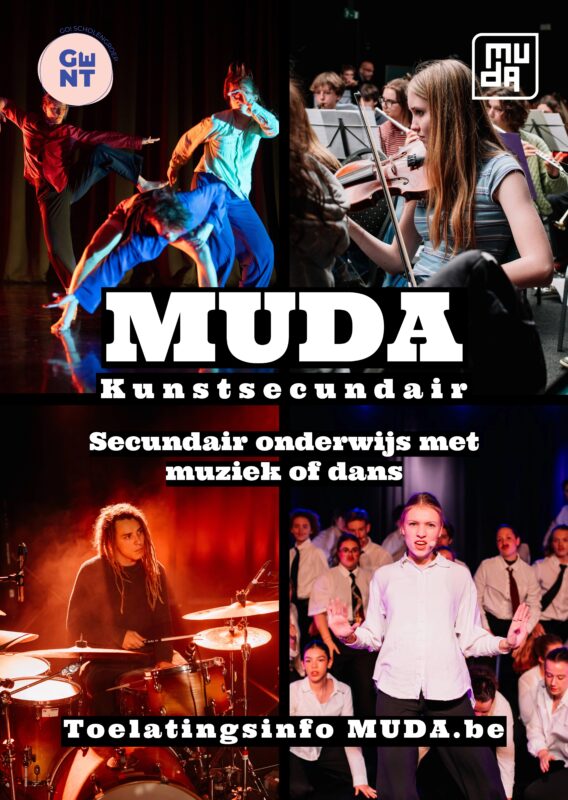 Het MUDA is een secundaire school voor muziek en dans. Je behaalt er je diploma secundair onderwijs in combinatie met een opleiding in muziek of dans op topniveau. In het MUDA kan je kiezen voor de opleiding hedendaagse dans, klassieke muziek, jazz/pop, songwriting, productie of muziektheater/musical.